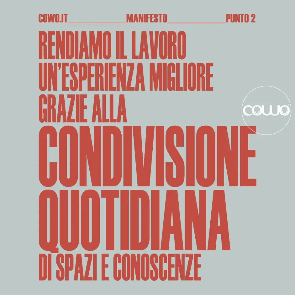 Il nostro modo di vivere e proporre il Coworking si fonda sui principi del Coworking Manifesto – la dichiarazione d’intenti formulata nel 2011 da Rete Cowo® per promuovere una visione chiara e condivisa del Coworking.
